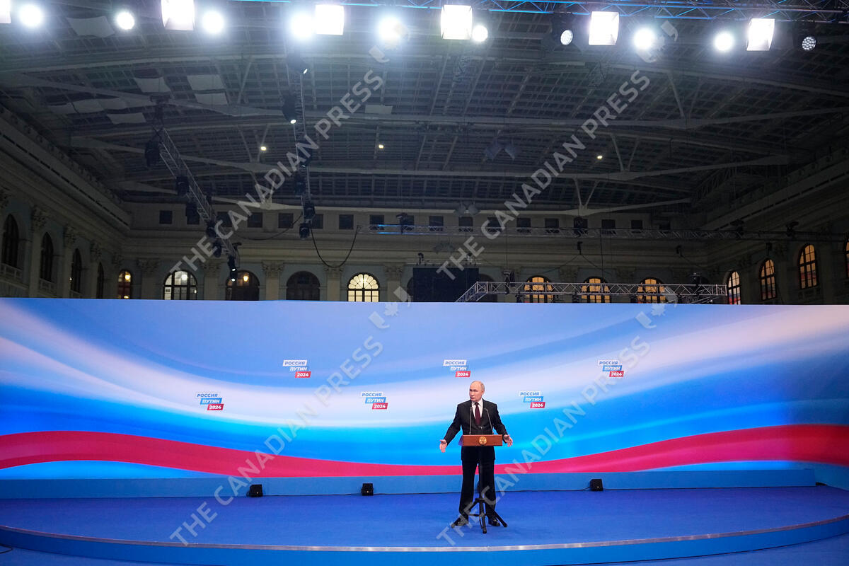 Russian President Vladimir Putin speaks on a visit to his campaign headquarters after a presidential election in Moscow in Moscow, Russia, early Monday, March 18, 2024. (AP Photo/Alexander Zemlianichenko)