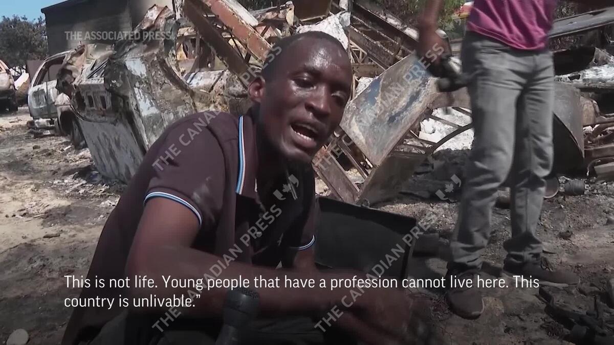 Residents were assessing the damage on Monday after gunmen belonging to an alliance of two powerful gangs in Haiti set fire to an open-air garage in downtown Port-au-Prince. The blaze at the space, which was used for parking and housed small stores and car mechanic workshops, erupted on Sunday. (Mar. 25) (AP/ Mikenson Duverger and Pierre Luxama)