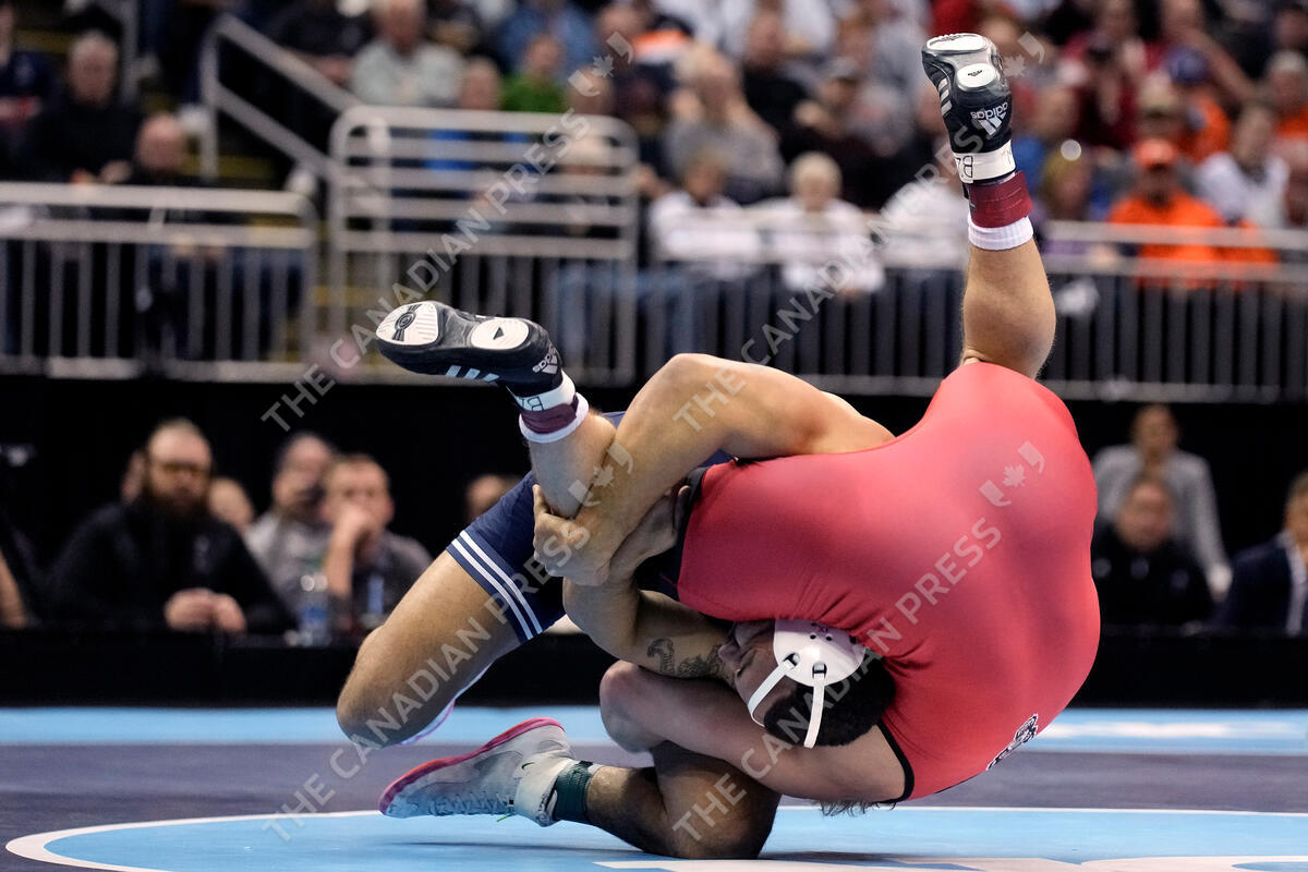 Penn State's Aaron Brooks, left, takes on NC State's Trent Hilday in their 197-pound match in the finals of the NCAA wrestling championships, Saturday, March 23, 2024, in Kansas City, Mo. (AP Photo/Charlie Riedel)
