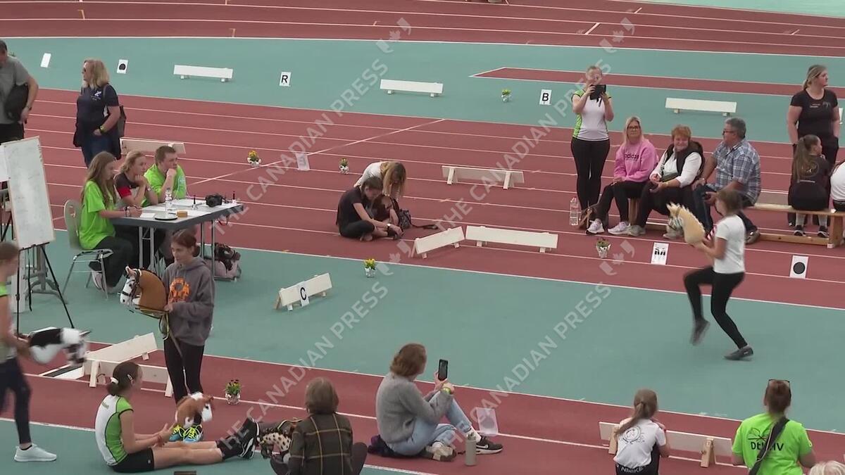 Germany's first hobby horsing championship gallops through Frankfurt this weekend, with hundreds of young riders competing in time jumping, style jumping and dressage on their wooden stick horses. Roughly 300 riders — mostly youngsters, but there are about 20 adults enrolled — were expected to canter around a gymnasium Saturday and Sunday, watched by 1,500 spectators. (AP Video/Daniel Niemann)