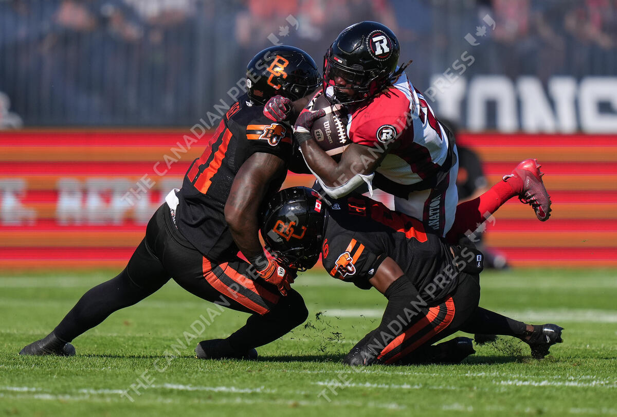 Ottawa Redblacks' Ryquell Armstead, top right, is tackled by B.C. Lions' Ayinde Eley, left, and T.J. Lee as he carries the ball during the first half of a CFL football game, in Victoria, B.C., on Saturday, August 31, 2024. THE CANADIAN PRESS/Darryl Dyck
