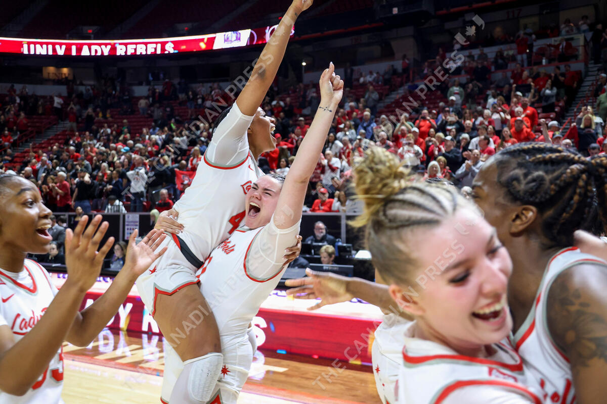 UNLV forward Alyssa Brown (44) and center Erica Collins (31) celebrate with teammates after a win over San Diego State in an NCAA college basketball game for the championship of the Mountain West women's tournament Wednesday, March 13, 2024, in Las Vegas. (AP Photo/Ian Maule)