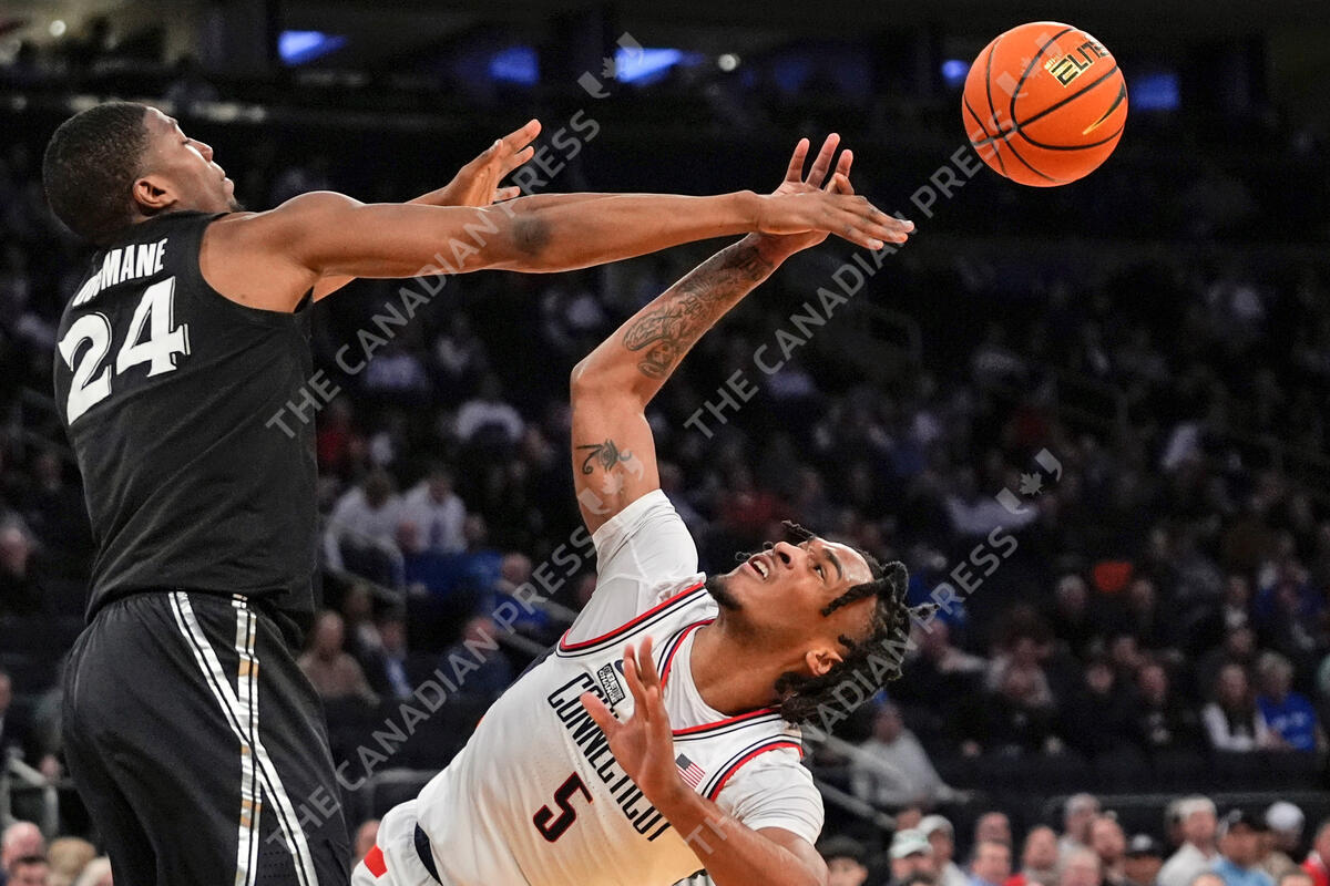 Xavier's Abou Ousmane (24) blocks a shot by UConn's Stephon Castle (5) during the first half of an NCAA college basketball game in the quarterfinal round of the Big East Conference tournament, Thursday, March 14, 2024, in New York. (AP Photo/Frank Franklin II)