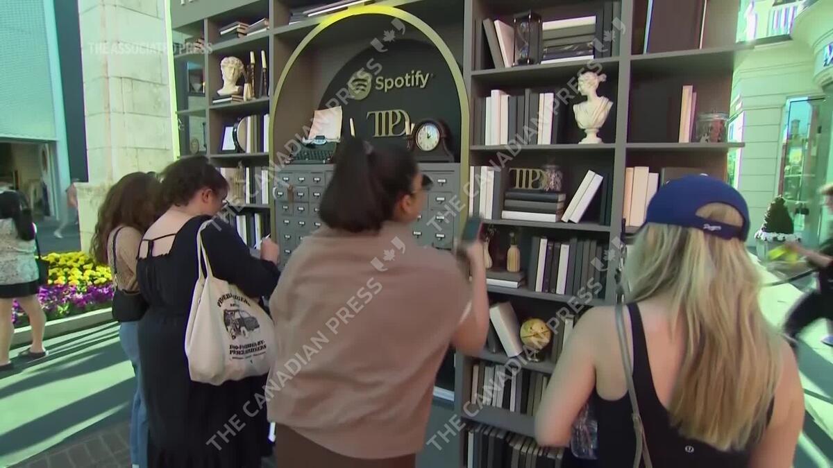 Taylor Swift fans took over the Grove in Los Angeles on Tuesday to celebrate Swift’s upcoming album, "The Tortured Poets Department." An installation organized by Spotify hid clues about lyrics contained on the record. (April 17)