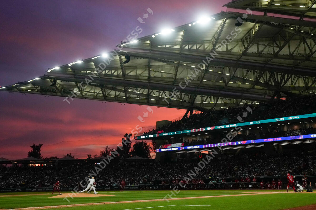 New York Yankees' pitcher Luis Serna, right, throws against Diablos Rojos' Jose Briceno at the second inning during an exhibition baseball game at Alfredo Harp Helu Stadium in Mexico City, Monday, March 25, 2024. (AP Photo/Fernando Llano)