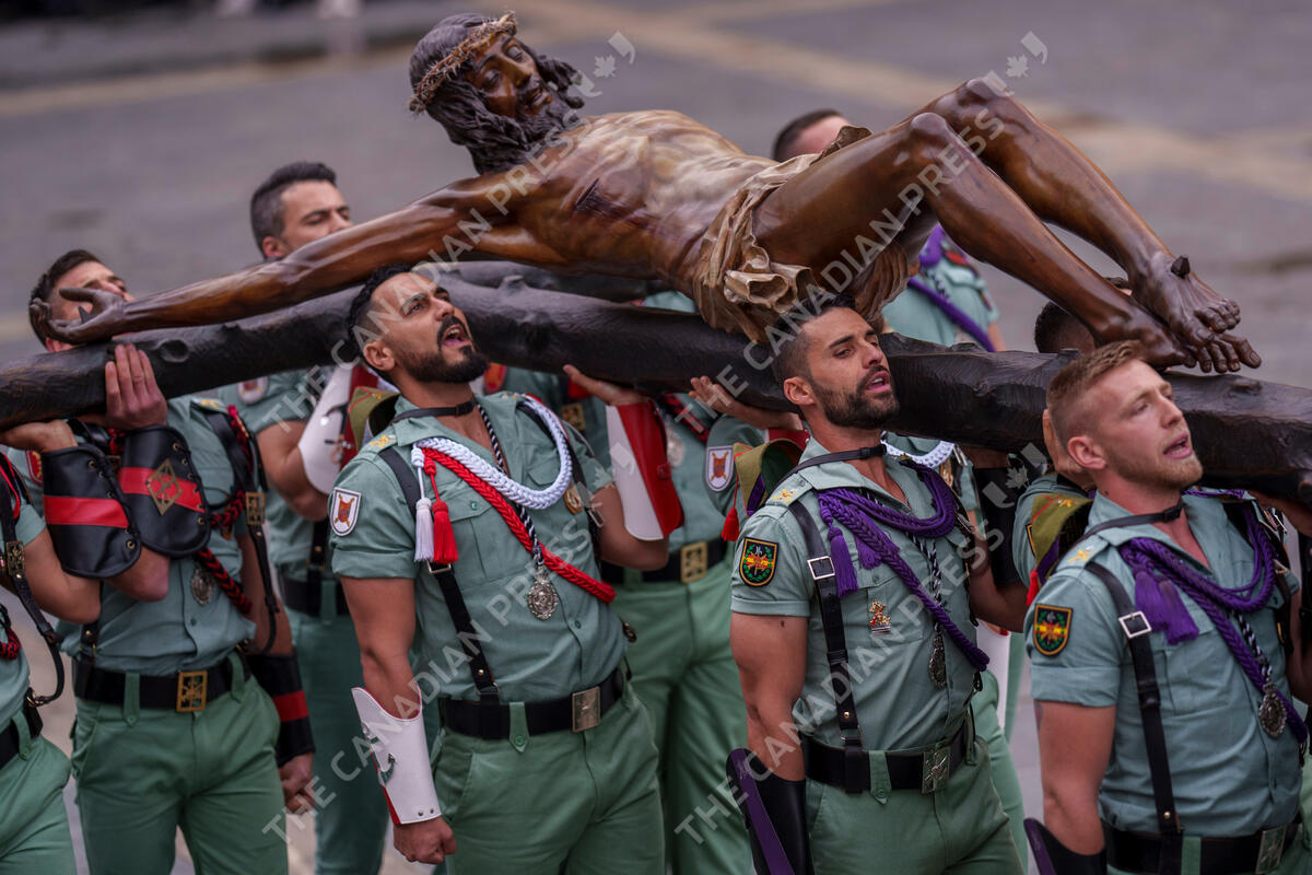 Members of the Spanish Legion, an elite unit of the Spanish Army, hold up the El Cristo de la Buena Muerte, or Christ of the Good Death, during a ceremony ahead of the procession in Malaga, Southern Spain, southern Spain, Thursday, March 28, 2024. Hundreds of processions will take place throughout Spain during the Easter Holy Week. (AP Photo/Manu Fernandez)