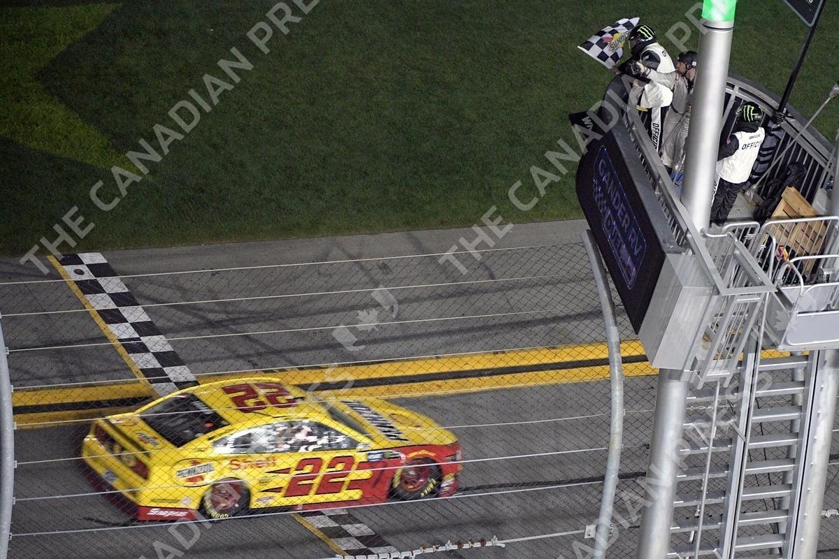 Joey Logano (22) takes the checkered flag to win the second of two qualifying races for the NASCAR Daytona 500 auto race at Daytona International Speedway Thursday, Feb. 14, 2019, in Daytona Beach, Fla. (AP Photo/Phelan M. Ebenhack)