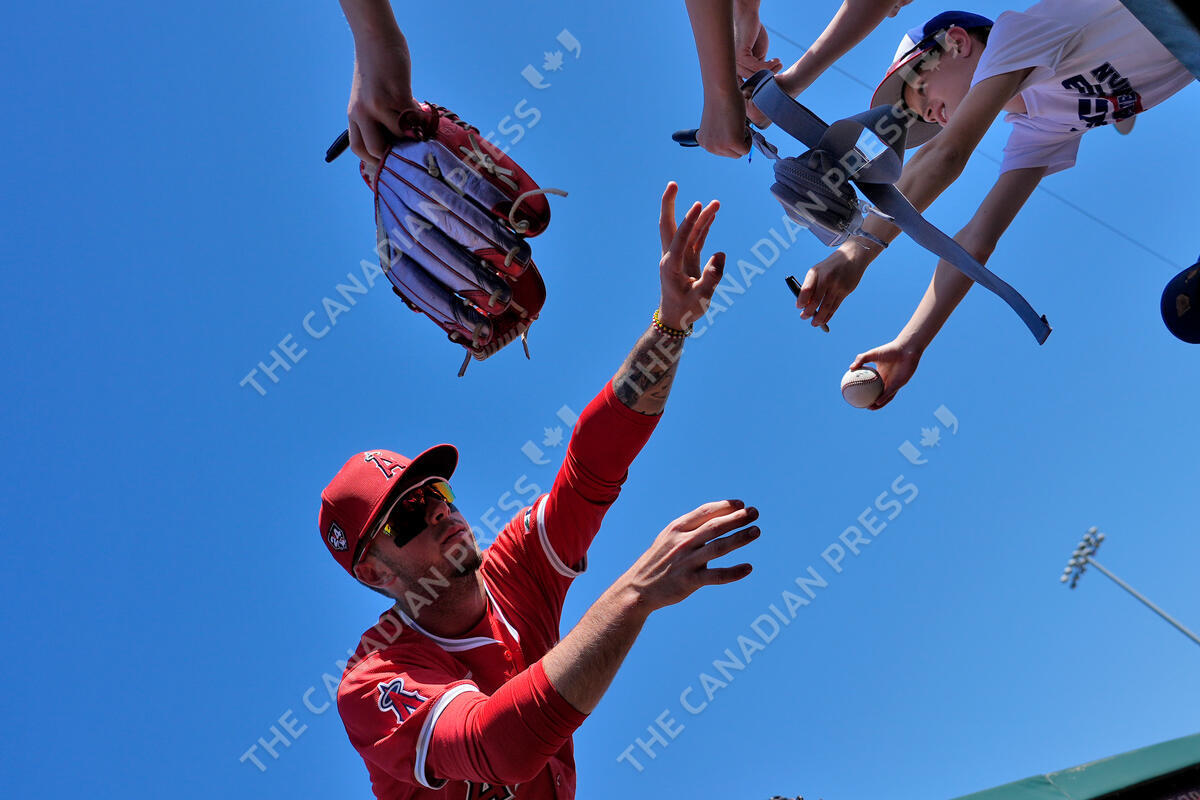Los Angeles Angels' Zach Neto signs autographs prior to a spring training baseball game against the Texas Rangers, Monday, March 11, 2024, in Tempe, Ariz. (AP Photo/Matt York)