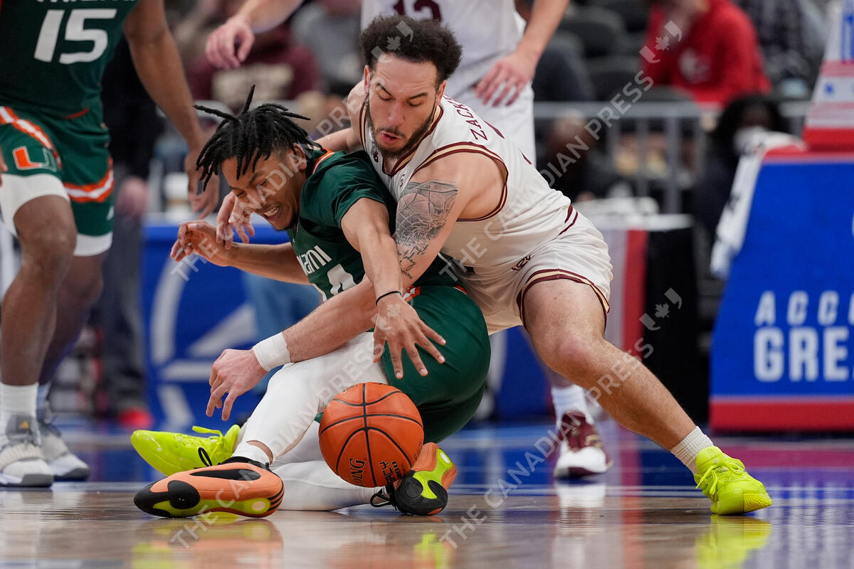 Miami guard Nijel Pack (24) and Boston College guard Jaeden Zackery (3) scramble for a loose ball during the first half of the Atlantic Coast Conference NCAA college basketball tournament Tuesday, March 12, 2024, in Washington. (AP Photo/Susan Walsh)