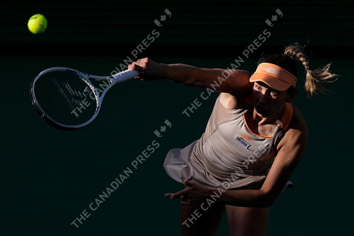 Elise Mertens, of Belgium, serves against Naomi Osaka, of Japan, at the BNP Paribas Open tennis tournament, Monday, March 11, 2024, in Indian Wells, Calif. (AP Photo/Mark J. Terrill)