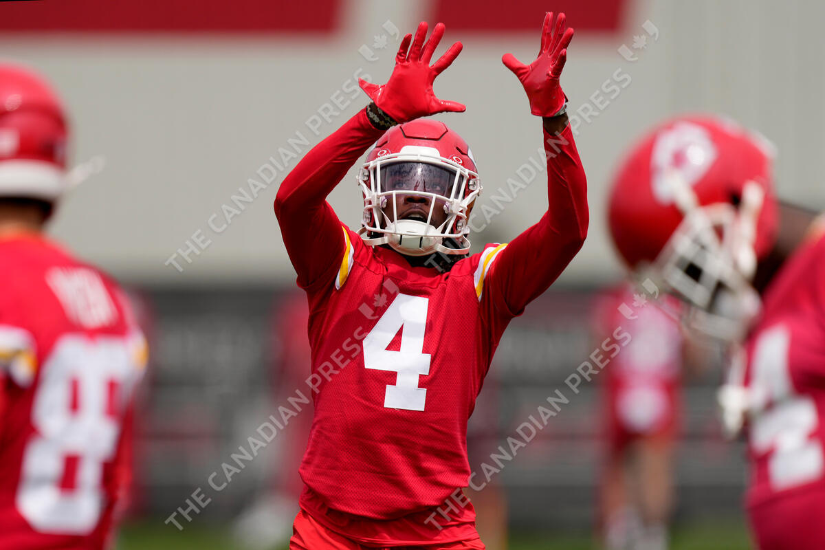 Kansas City Chiefs wide receiver Rashee Rice looks to catch a pass during the NFL football team's organized team activities Wednesday, May 22, 2024, in Kansas City, Mo. (AP Photo/Charlie Riedel)