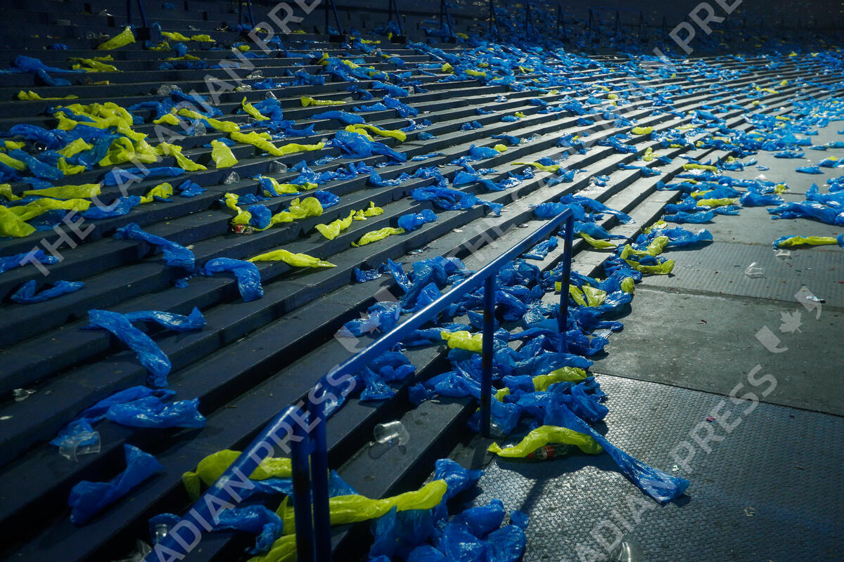Plastics with the colors of Argentina's Boca Juniors lay on the bleachers after the team lost 5-6 to Brazil's Corinthians in a penalty shootout during a Copa Libertadores round of sixteen soccer match in Buenos Aires, Argentina, Wednesday, July 6, 2022. (AP Photo/Victor R. Caivano)