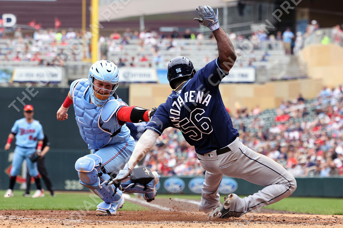 Tampa Bay Rays' Randy Arozarena scores against Minnesota Twins catcher Ryan Jeffers (27) during the fourth inning of a baseball game, Sunday, June 12, 2022, in Minneapolis. (AP Photo/Stacy Bengs)