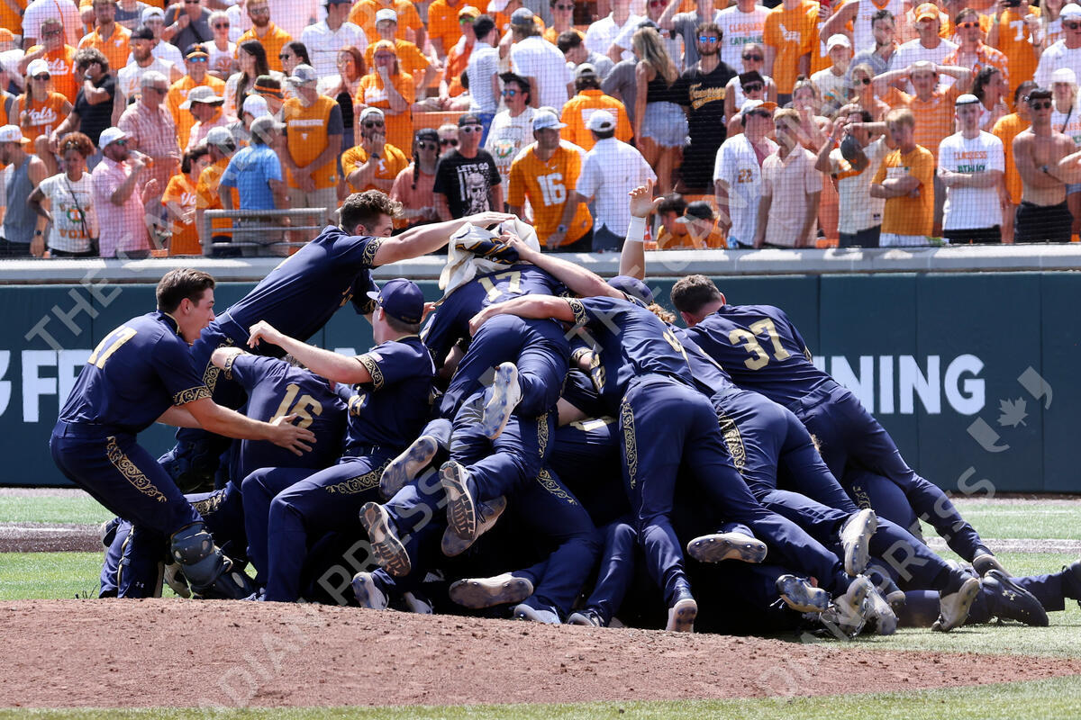 Notre Dame players celebrate after defeating Tennessee in an NCAA college baseball super regional game, Sunday, June 12, 2022, in Knoxville, Tenn. (AP Photo/Randy Sartin)