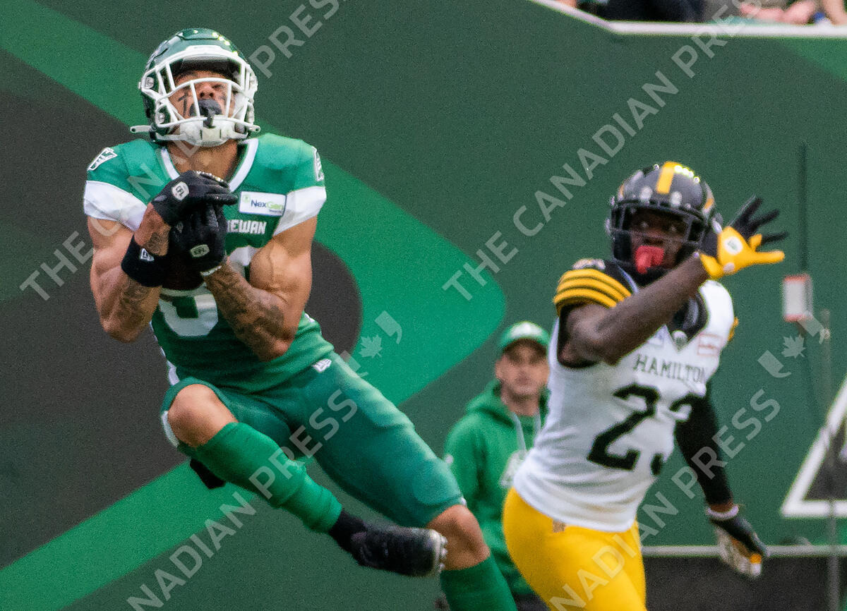 Saskatchewan Roughriders receiver Kian Schaffer-Baker (89) catches the football for a touchdown as Hamilton Tiger-Cats defensive back Richard Leonard (23) looks on during second half CFL football action in Regina on Saturday, June 11, 2022. THE CANADIAN PRESS/Heywood Yu