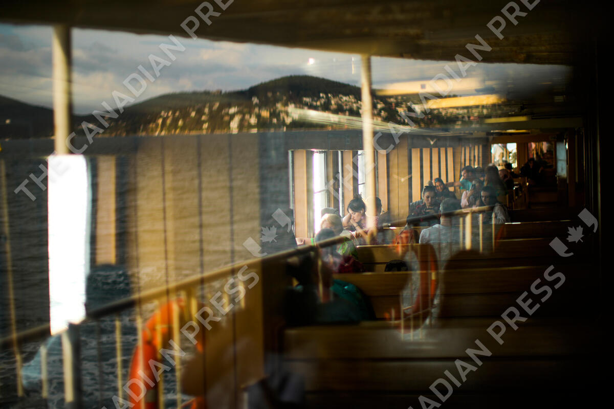People take a ride in a ferry crossing the Bosphorus strait in Istanbul, Turkey, Sunday, June 12, 2022. (AP Photo/Francisco Seco)