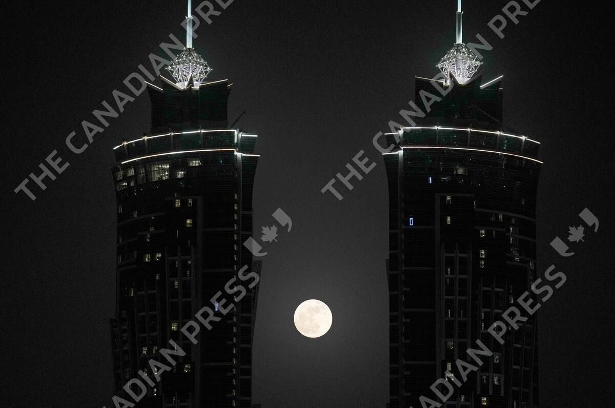 The full moon rises between two towers, in Dubai, United Arab Emirates, Tuesday, June 14, 2022. (AP Photo/Kamran Jebreili)