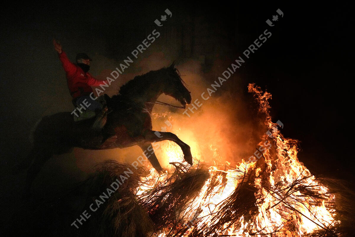 A man rides a horse through a bonfire as part of a ritual in honor of Saint Anthony the Abbot, the patron saint of domestic animals, in San Bartolome de Pinares, Spain, Tuesday, Jan. 16, 2024. On the eve of Saint Anthony's Day, dozens ride their horses through the narrow cobblestone streets of the small village of San Bartolome during the "Luminarias," a tradition that dates back 500 years and is meant to purify the animals with the smoke of the bonfires and protect them for the year to come. (AP Photo/Bernat Armangue)