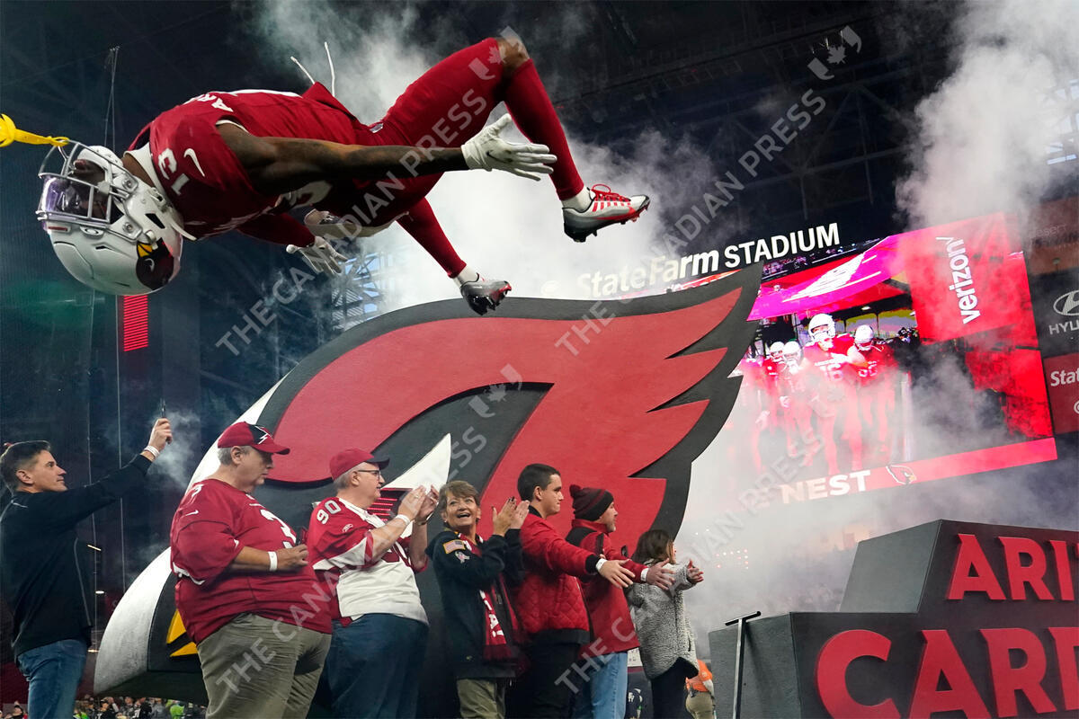 Arizona Cardinals cornerback Kei'Trel Clark (13) does a flip as he takes the field for an NFL football game against the Seattle Seahawks Sunday, Jan. 7, 2024, in Glendale, Ariz. (AP Photo/Ross D. Franklin)