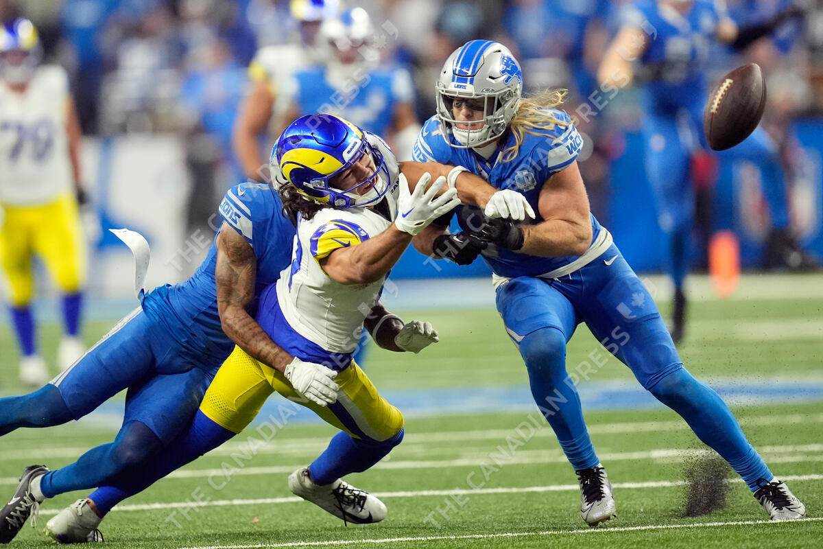 Detroit Lions cornerback Cameron Sutton (1) deflects a pass intended for Los Angeles Rams wide receiver Puka Nacua (17) during the second half of an NFL wild-card playoff football game, Sunday, Jan. 14, 2024, in Detroit. (AP Photo/Paul Sancya)