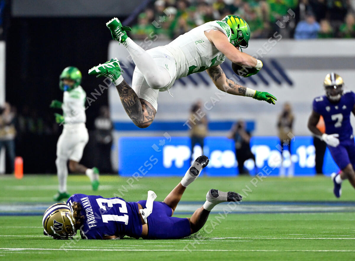Oregon tight end Terrance Ferguson (3) is tripped up by Washington cornerback Kamren Fabiculanan (13) during the first half of the Pac-12 championship NCAA college football game Friday, Dec. 1, 2023, in Las Vegas. (AP Photo/David Becker)
