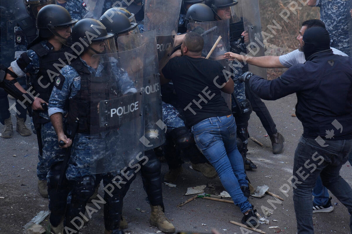 Lebanese-Armenian protesters clash with riot police near the Azerbaijani Embassy, during a protest to denounce the Azerbaijani military offensive that recaptured Nagorno-Karabakh from the separatist Armenian authorities in the enclave, in Ain Aar, east of Beirut, Lebanon, Thursday, Sept. 28, 2023. A 24-hour Azerbaijani blitz last week forced Armenian separatist authorities to sit down for talks on Nagorno-Karabakh's "reintegration" into Azerbaijan. (AP Photo/Hussein Malla)