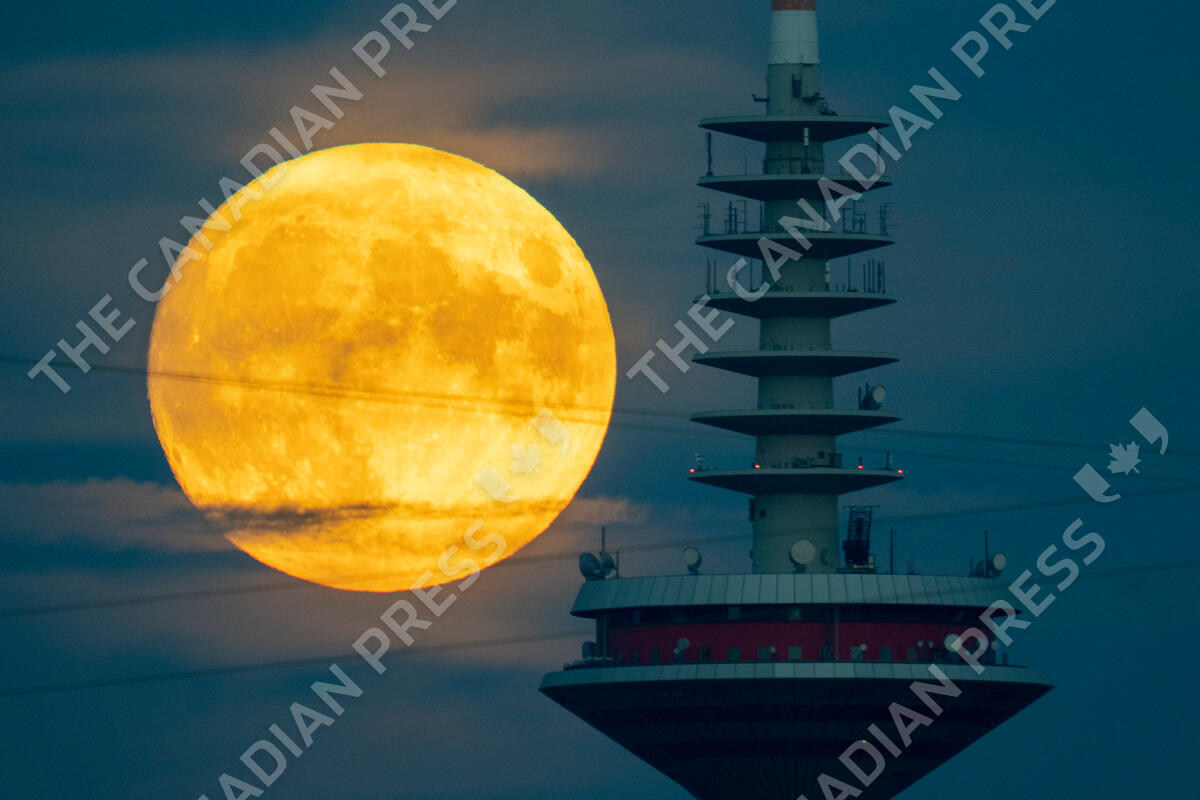 The moon rises next to the television tower in Frankfurt, Germany, Thursday, Sept. 28, 2023. (AP Photo/Michael Probst)