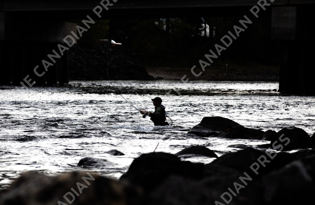 Jordi Olivera, of Spain, competes in the 2023 Masters and Ladies World Fly Fishing Championships on the Clearwater River in Clearwater, B.C., on Wednesday, Sept. 27, 2023. Participants are competing at different sites around Interior B.C. THE CANADIAN PRESS/Marissa Tiel
