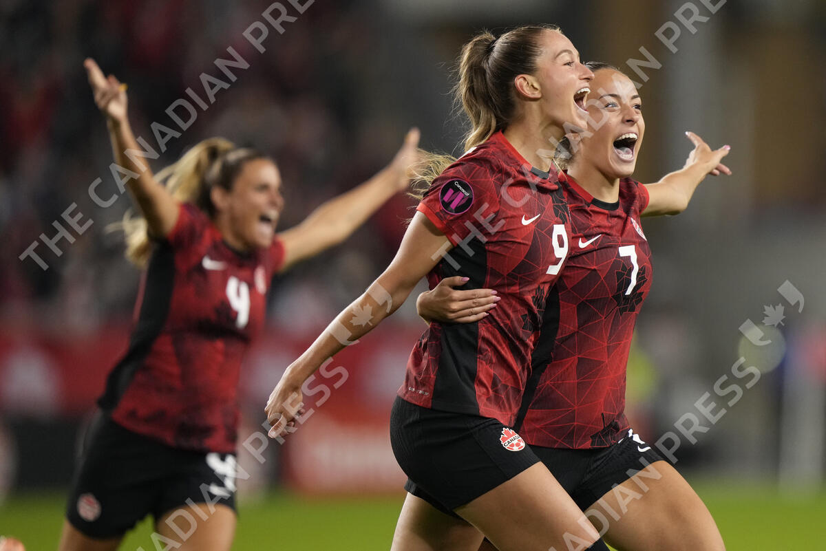 Canada's Jordyn Huitema, 9, celebrates her goal with teammates Julia Grosso, 7, and Shelina Zadorsky, 4, during second half CONCACAF women's championship soccer series match against Jamaica in Toronto on Tuesday Sept. 26, 2023. THE CANADIAN PRESS/Nathan Denette