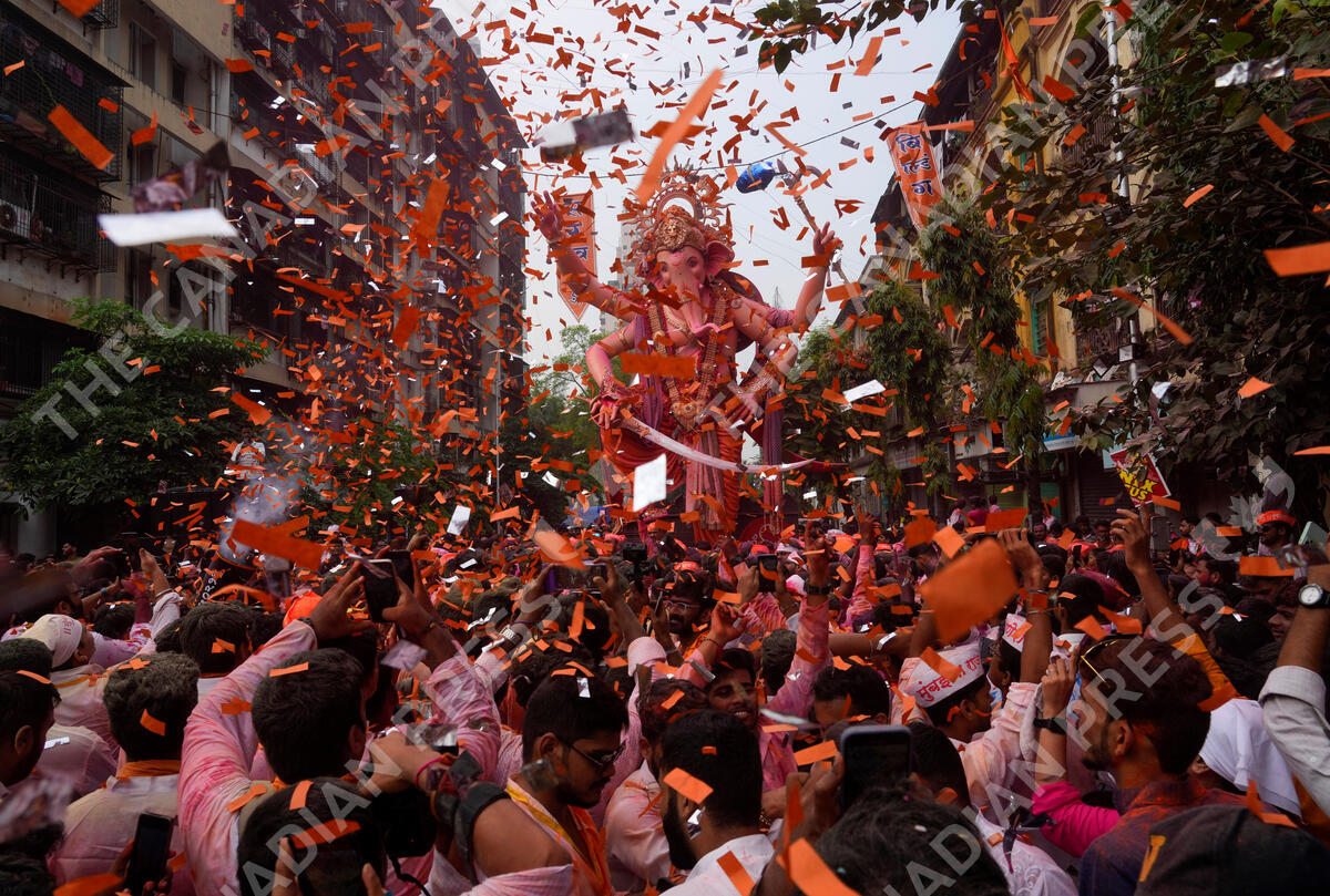 An idol of elephant-headed Hindu god Ganesha is taken for immersion on the final day of the ten-day long Ganesh Chaturthi festival in Mumbai, India, Thursday, Sept. 28, 2023. The festival is a celebration of the birth of Ganesha, the Hindu god of wisdom, prosperity and good fortune. (AP Photo/Rafiq Maqbool)