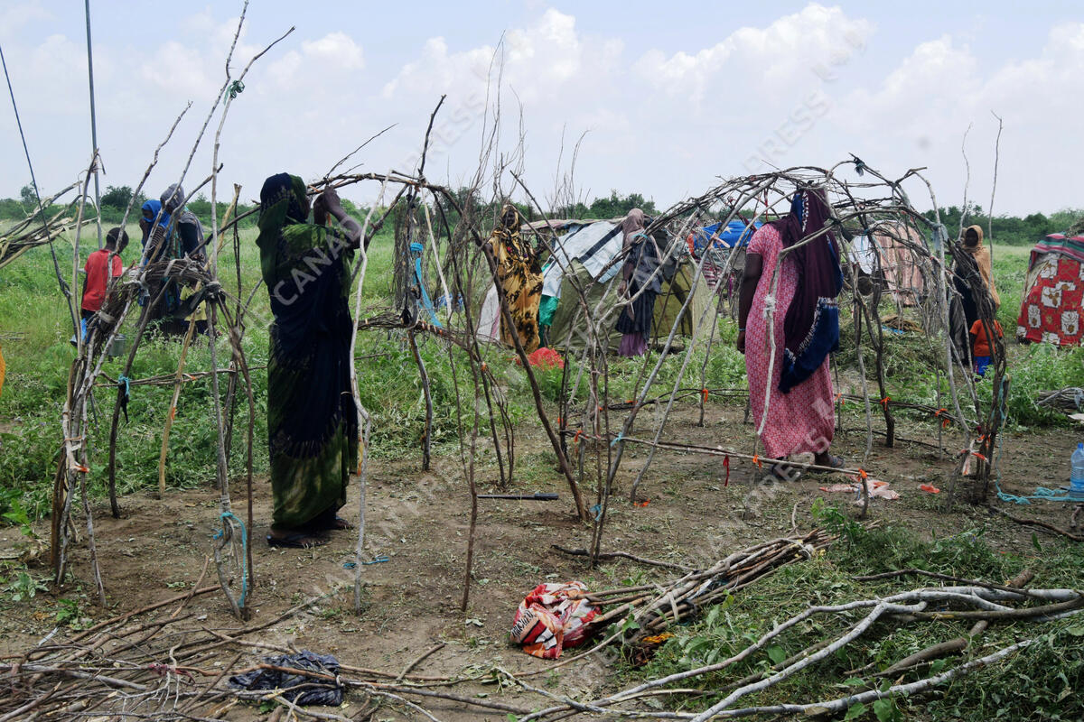 People displaced after their homes were swept away by flash floods, construct shelters from branches, on the grounds of the Shela Primary School in Garsen, Kenya, Sunday, Dec. 3, 2023. (AP Photo/Gideon Maundu)