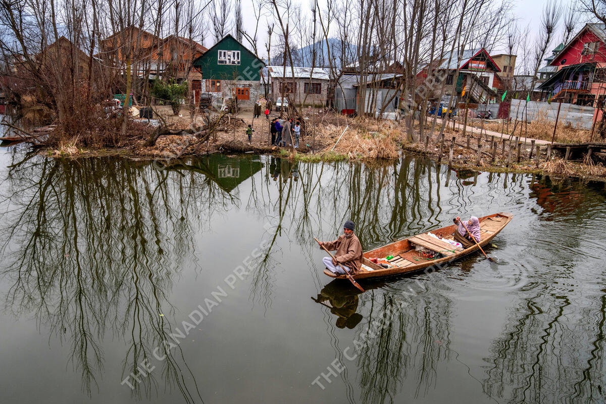 A couple on their way home after the day's work row a shikara, or traditional boat, in the interiors of the Dal Lake in Srinagar, Indian controlled Kashmir, Thursday, Feb. 29, 2024. (AP Photo/Dar Yasin)A couple