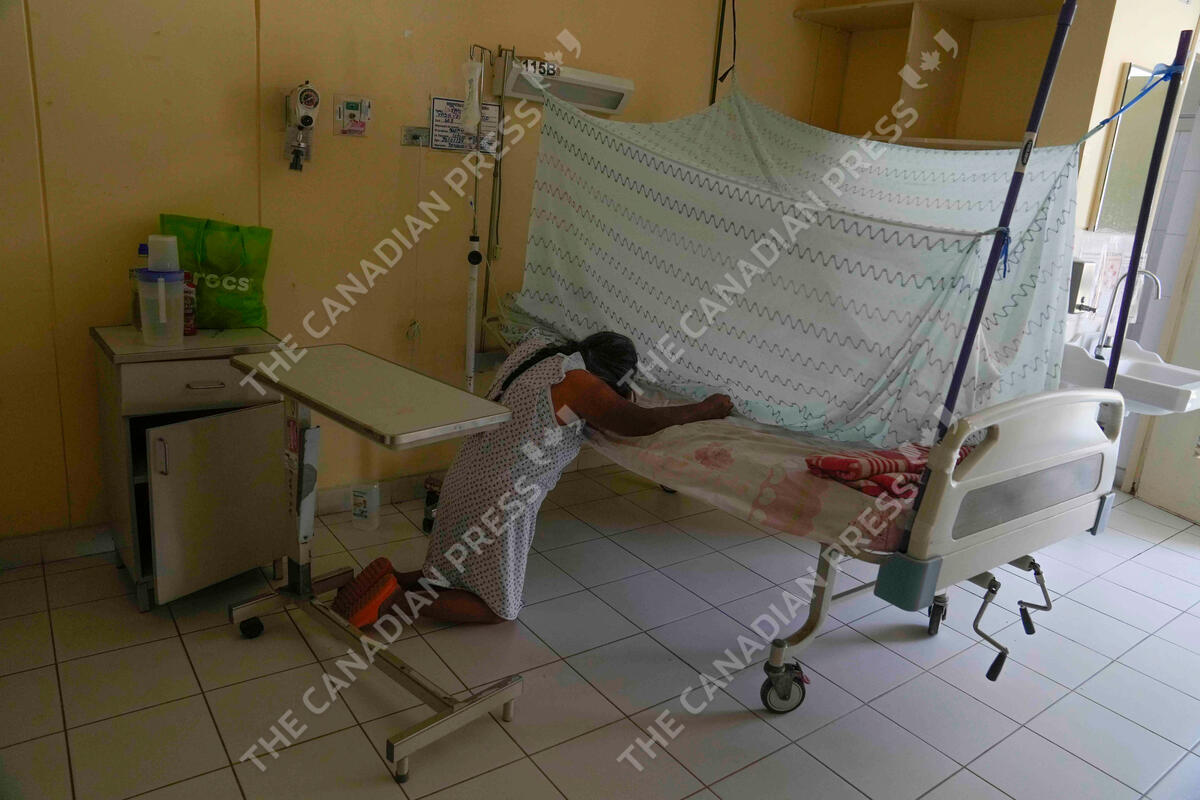 Ana Pasapera, who suffers from dengue, prays beside her bed at La Merced Hospital in Paita, Peru, Thursday, Feb. 29, 2024. Peru declared a health emergency in most of its provinces on Feb. 26 due to a growing number of dengue cases. (AP Photo/Martin Mejia)