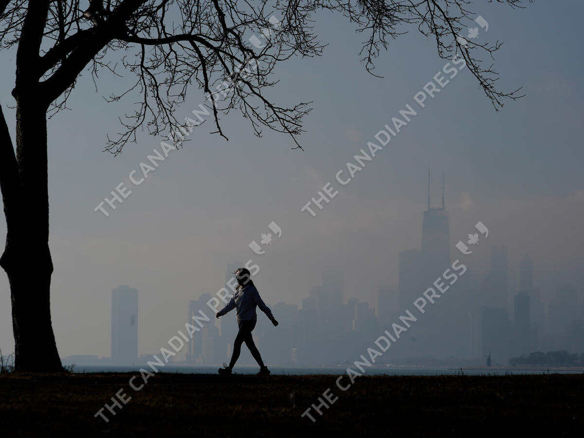 A person walks along the shore of Lake Michigan, Tuesday, Feb. 27, 2024, in Chicago. AP Photo/Kiichiro Sato)