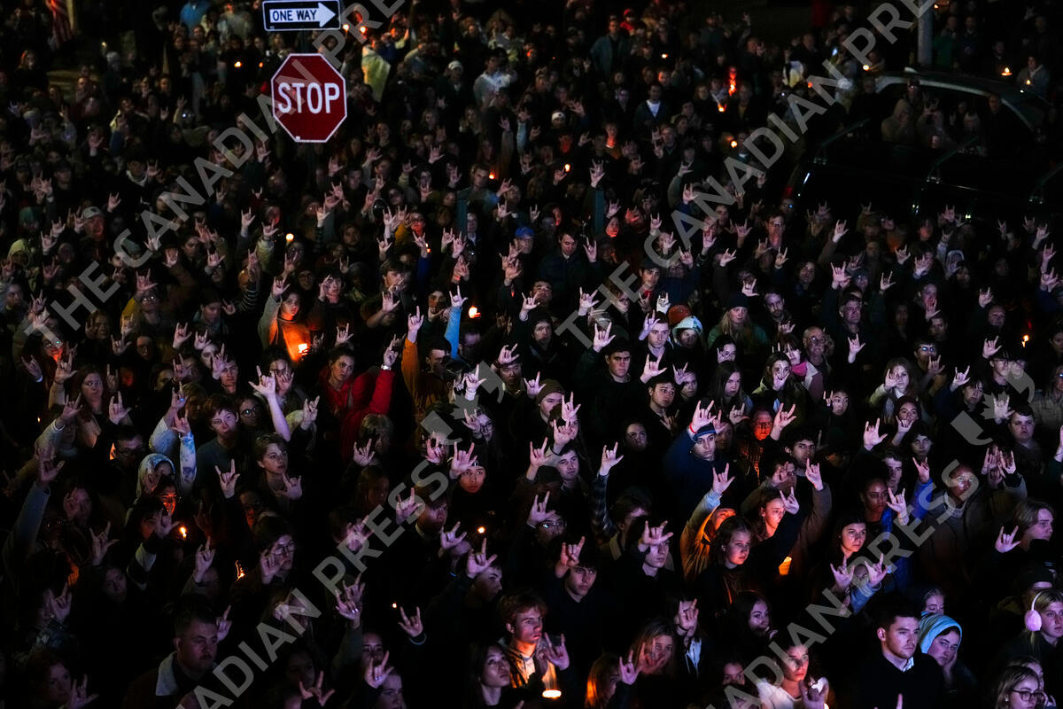 People sign "I love you" while gathered at a vigil for the victims of Wednesday's mass shootings, Sunday, Oct. 29, 2023, outside the Basilica of Saints Peter and Paul in Lewiston, Maine. Several members of the deaf community were among the dead. (AP Photo/Matt Rourke)