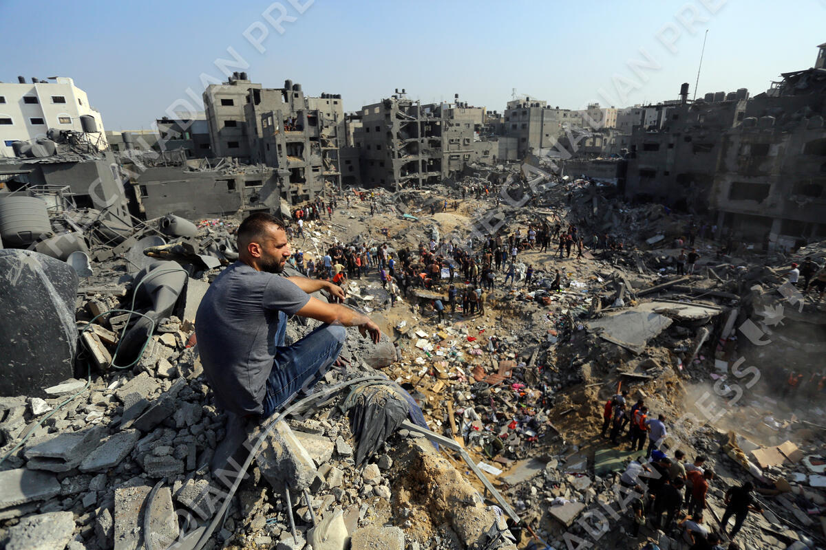 A man sits on the rubble as others wander among debris of buildings that were targeted by Israeli airstrikes in Jabaliya refugee camp, northern Gaza Strip, Wednesday, Nov. 1, 2023. (AP Photo/Abed Khaled)