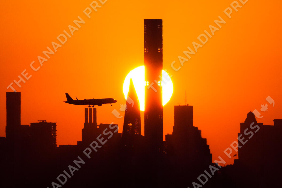 The sun sets behind the Manhattan skyline as plane approaches LaGuardia Airport for a landing, seen from the U.S. Open tennis championships, Wednesday, Sept. 6, 2023, in New York. (AP Photo/Frank Franklin II)