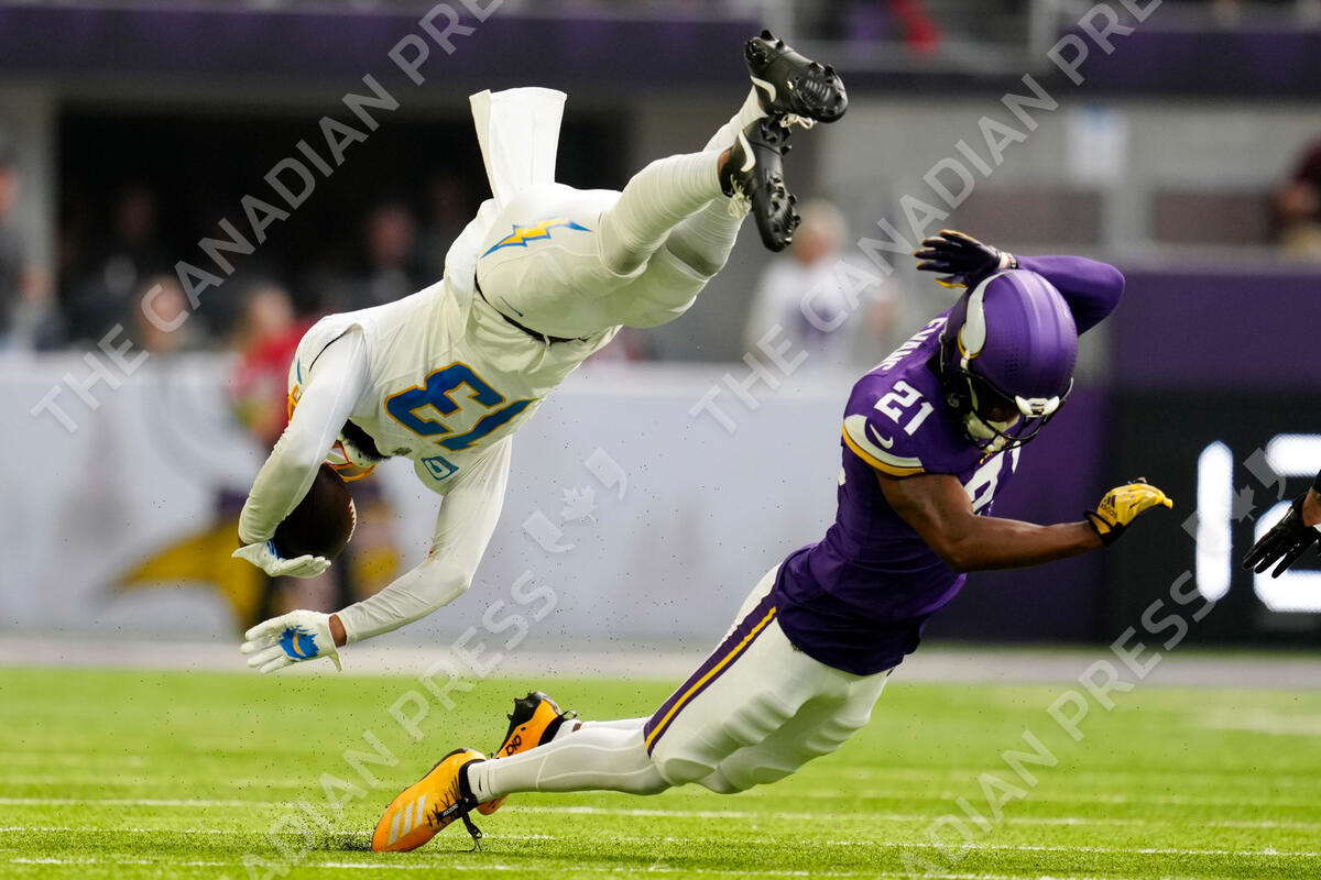 Los Angeles Chargers wide receiver Keenan Allen (13) is tackled by Minnesota Vikings cornerback Akayleb Evans (21) after catching a pas during the first half of an NFL football game, Sunday, Sept. 24, 2023, in Minneapolis. (AP Photo/Abbie Parr)