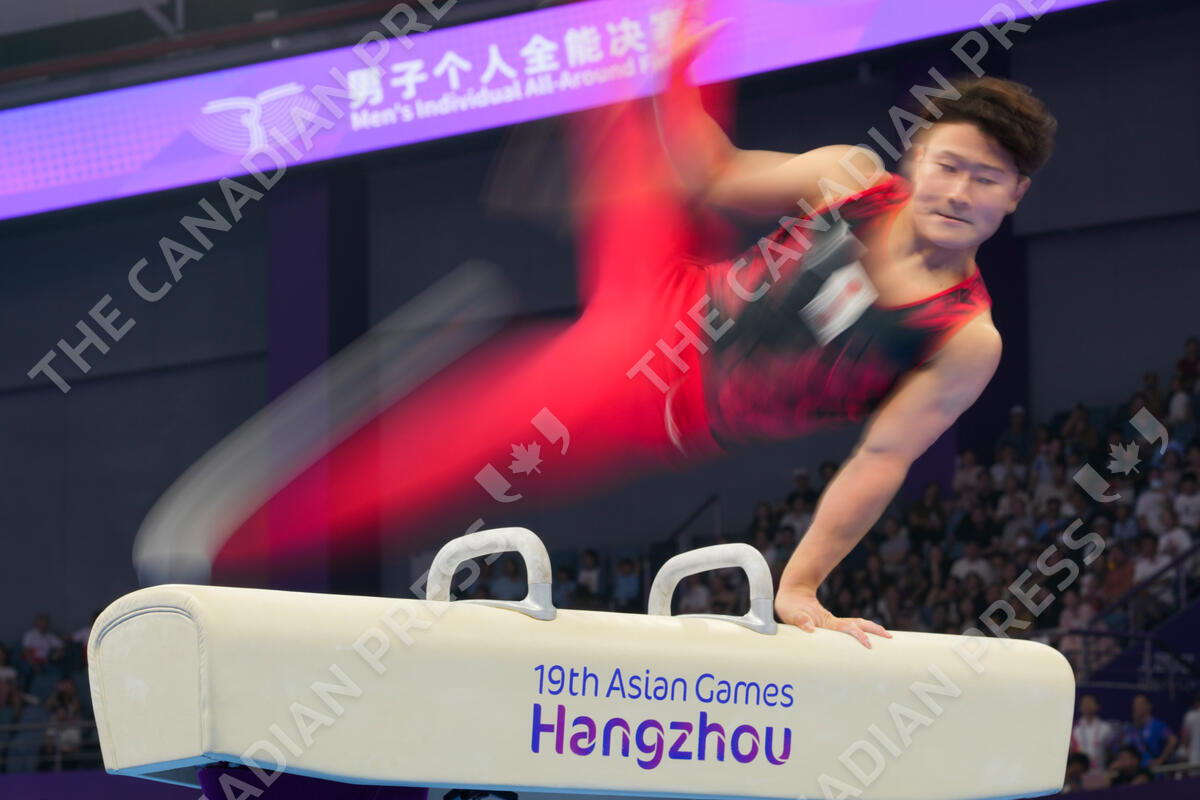 Takeru Kitazono of Japan competes on the pommel horse during the men's all-around individuals gymnastics event of the 19th Asian Games in Hangzhou, China, Tuesday, Sept. 26, 2023. Kitazono won bronze medal. (AP Photo/Aaron Favila)