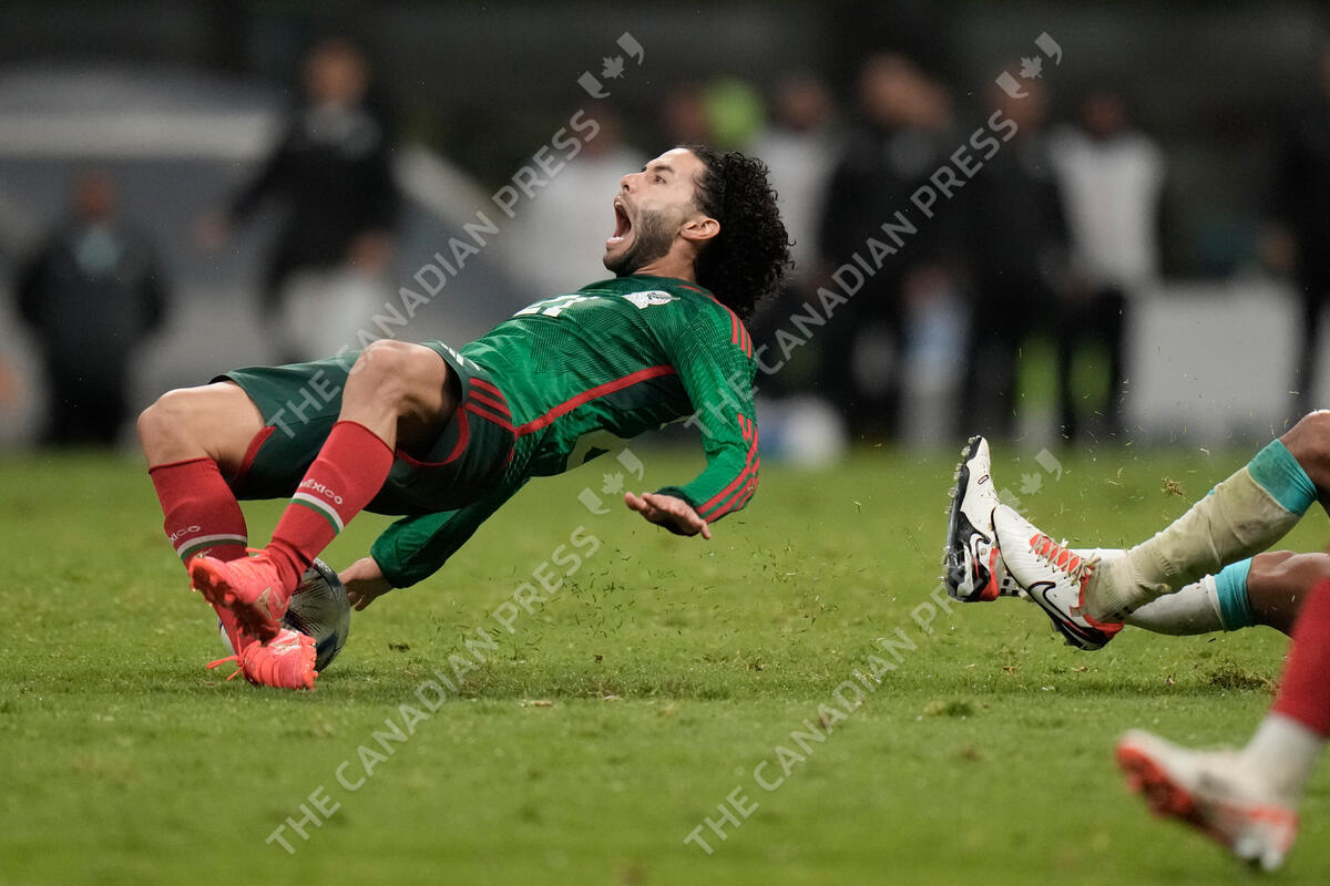 Mexico's Cesar Huerta falls on the pitch after he is fouled by Honduras' Denil Maldonado, during a CONCACAF Nations League quarterfinal second leg soccer match, at Azteca stadium in Mexico City, Tuesday, Nov. 21, 2023. El Tri went on to defeat Honduras 4-2 on penalty kicks to qualify for next year's Copa America. (AP Photo/Eduardo Verdugo)