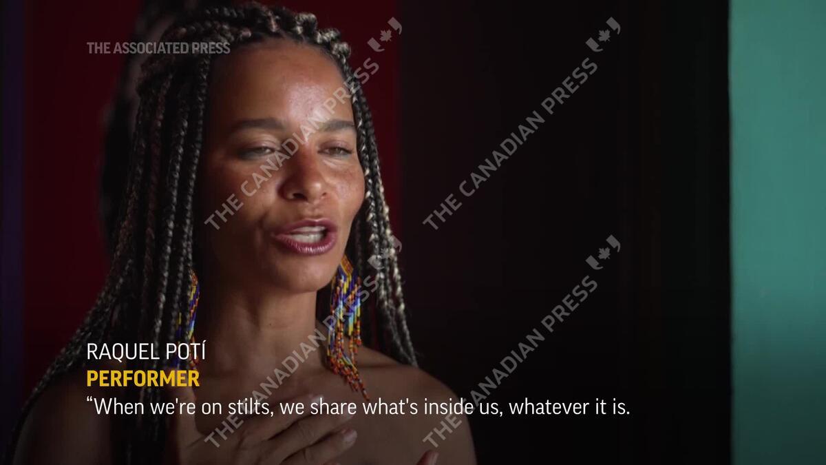 Stilt walker Raquel Potí regularly graces the front pages of Brazilian magazines and newspapers, and on Saturday the artist donned a lavish feathered costume and lacquered her body in gold glitter. At one point she charged the length of the carnival street party, sweeping her rainbow wings like she was about to take flight. It was the latest of her charismatic stilt walking performances that has prompted some media to call her the muse of Rio de Janeiro’s Carnival. (Feb. 11) (AP by Lucas Dumphreys)